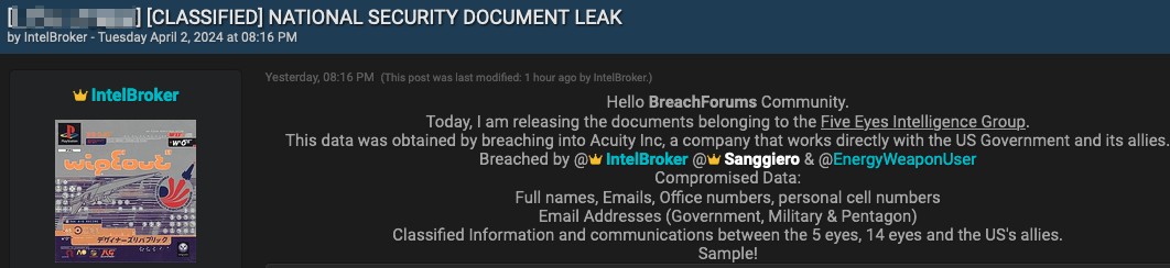 IntelBroker has been leaking data allegedly stolen from or belonging to multiple U.S. government agencies since December, including but not limited to the Immigration and Customs Enforcement (ICE), the Citizenship and Immigration Services (USCIS), the Department of Defense, and the U.S. Army.