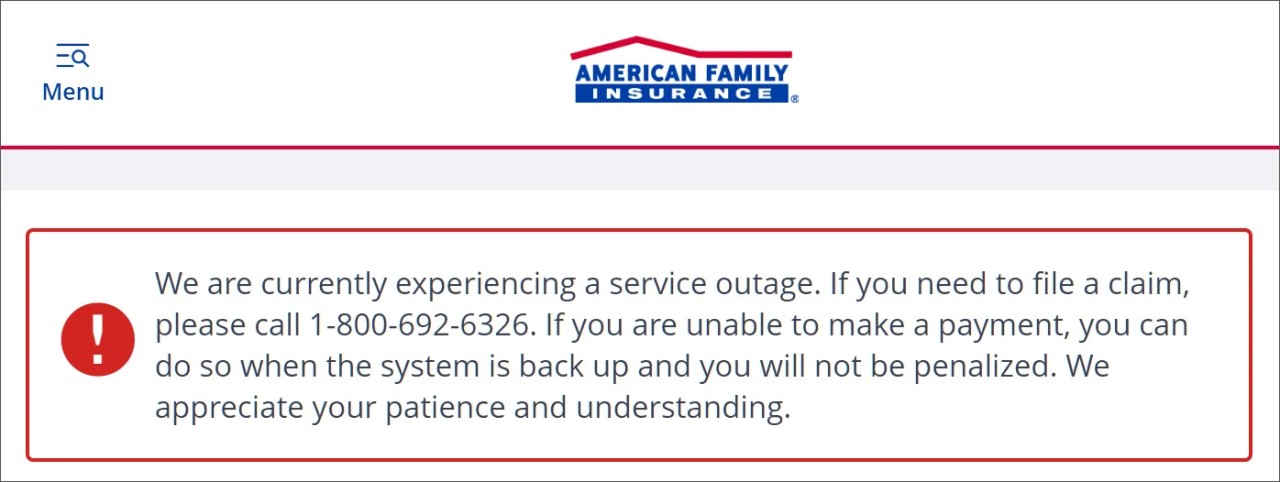"We are currently experiencing a service outage. If you need to file a claim, please call 1-800-692-6326," reads a message on AmFam's site.