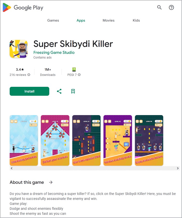 Of particular interest are the following four adware (HiddenAds) apps disguised as games: