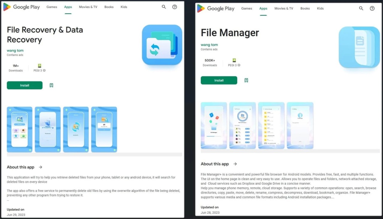 File Recovery and Data Recovery, identified as "com.spot.music.filedate" on devices, has at least 1 million installs. The install count for File Manager reads at least 500,000 and it can be identified on devices as "com.file.box.master.gkd."