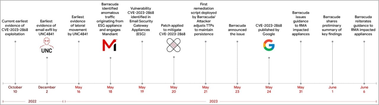 Starting on approximately October 10, 2022, the threat actors began exploiting CVE-2023-2868, a zero-day remote command injection vulnerability in Barracuda's email attachment scanning module.