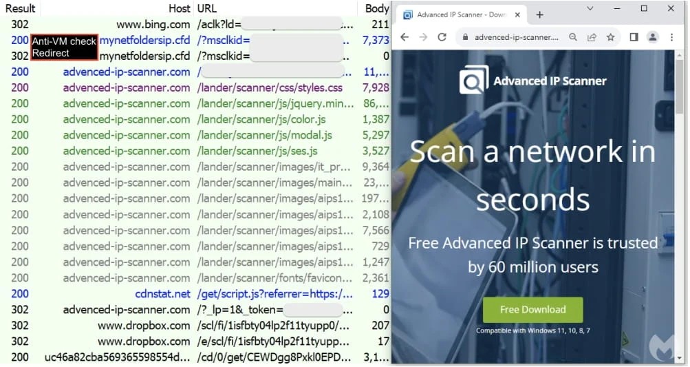 The victims are then redirected to 'advenced-ip-scanner[.]com', a clone of Advanced IP Scanner that uses typosquatting (notice the e in advenced) to trick visitors.