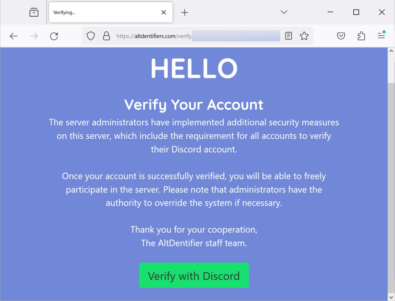 After clicking the link to 'verify' their account, the potential victims are prompted by the AltDentifiers phishing website to verify with Discord, aiming to steal their Discord login credentials.