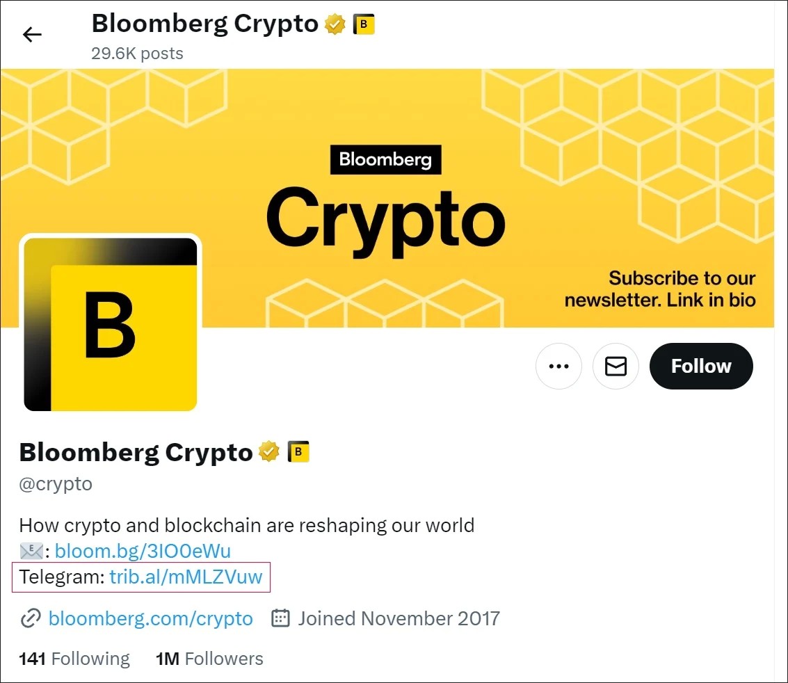 In October 2023, they updated the Telegram username to @BloombergCrypto. However, a scammer seized the old Telegram username during this transition. Exploiting the fact that Bloomberg's previous Telegram link remained active, the scammer used it today as part of a phishing scheme.