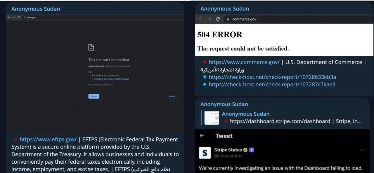 Since the start of the week, Anonymous Sudan claimed they had taken down the website of EFTPS.gov (the U.S. Treasury Dept's Electronic Federal Tax Payment System) and the U.S. Commerce Dept. website.