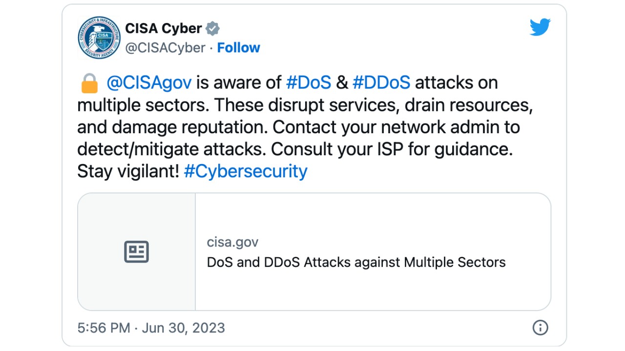 "CISA is aware of open-source reporting of targeted denial-of-service (DoS) and distributed denial-of-service (DDoS) attacks against multiple organizations in multiple sectors," the cybersecurity agency said.