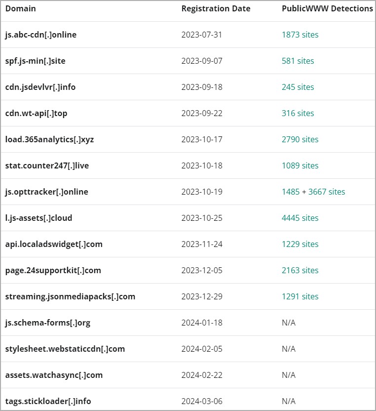These URLs are used to fetch further malicious scripts that are run in a visitor's browser.