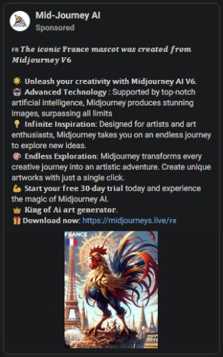 While this page has since been taken down, the threat actors launched a new page that is still active with over 600,000 members that is pushing a fake Midjourney site distributing malware.
