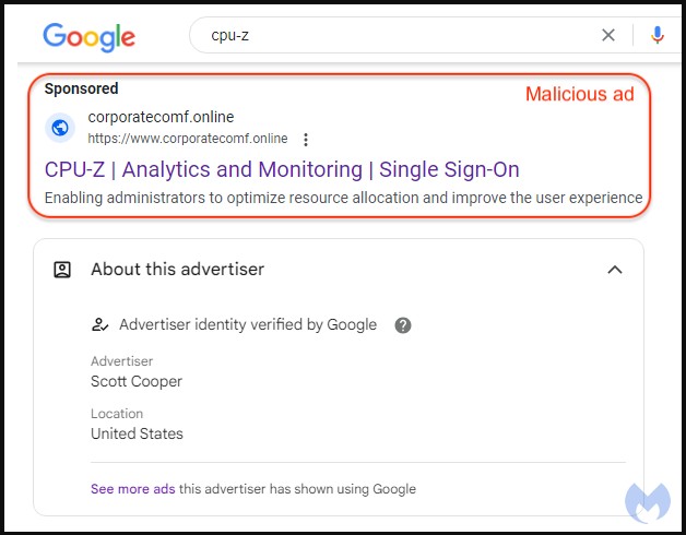 A threat actor has been abusing Google Ads to distribute a trojanized version of the CPU-Z tool to deliver the Redline info-stealing malware.