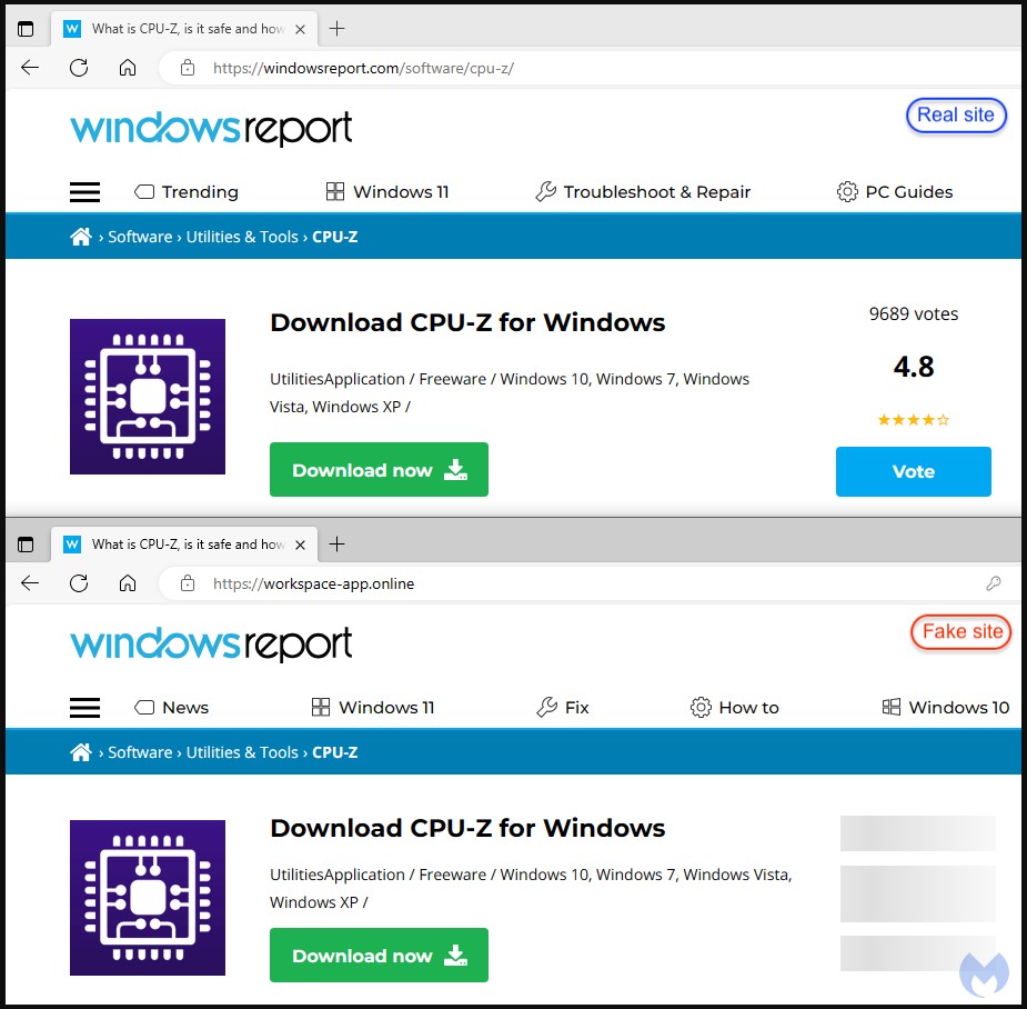 The malicious Google advertisement for the trojanized CPU-Z, a tool that profiles computer hardware on Windows, is hosted on a cloned copy of the legitimate Windows news site WindowsReport.