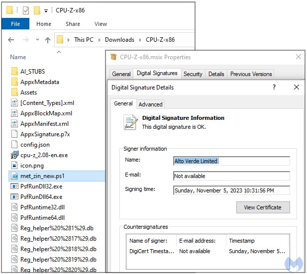 Clicking on the 'Download now' button results in receiving a digitally-signed CPU-Z installer (MSI file) containing a malicious PowerShell script identified as the 'FakeBat' malware loader.