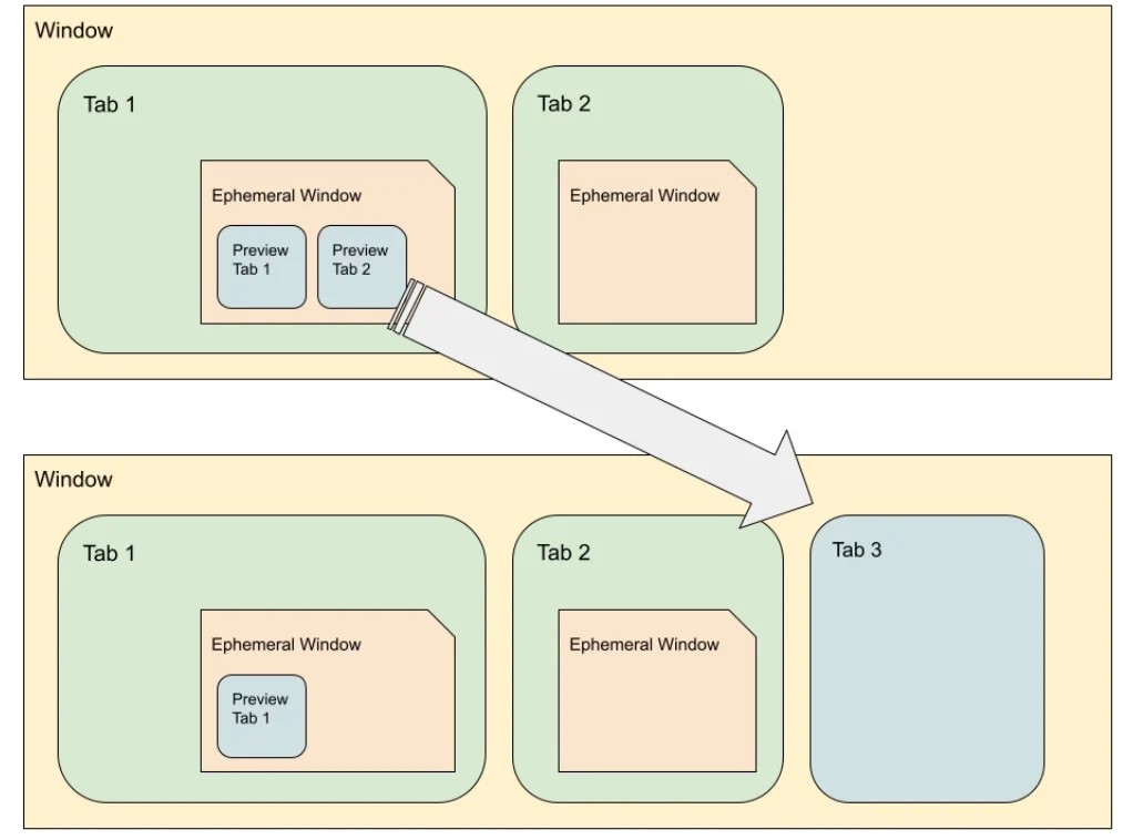 One intriguing approach detailed by Google is the idea of "Ephemeral Window and Tabs". Drawing inspiration from Chrome's ephemeral tab feature for Android, this concept involves the introduction of an ephemeral/temporary window that holds multiple preview tabs within each standard tab.