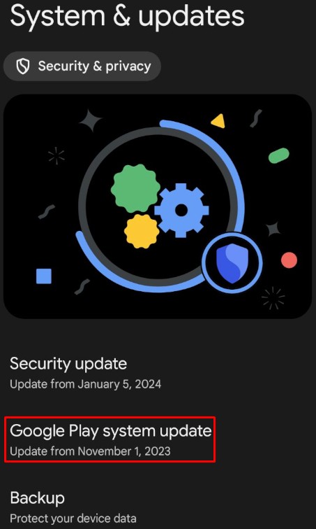 Google Play system updates are separate from the monthly security patches, both accessible via Settings > Security & privacy > System & updates.
