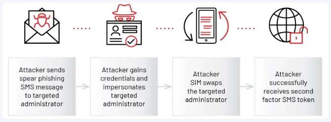 However, the attacker had already SIM-swapped the administrator's number and ported it to their device, so they received the 2FA token without the victim realizing the breach.