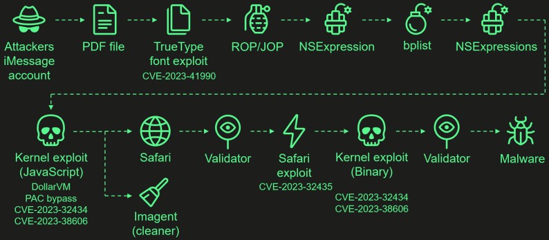 The attacks start with a malicious iMessage attachment sent to the target, while the entire chain is zero-click, meaning it does not require interaction from the user, and doesn't generate any noticeable signs or traces.
