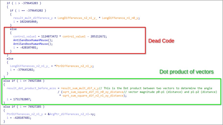 As a last line of defense against scrutiny, Lumma 4.0 incorporates obstacles within its code, like opaque predicates that unnecessarily complicate the program's logic, and blocks of dead code injected within functional code segments to create confusion and analysis errors.