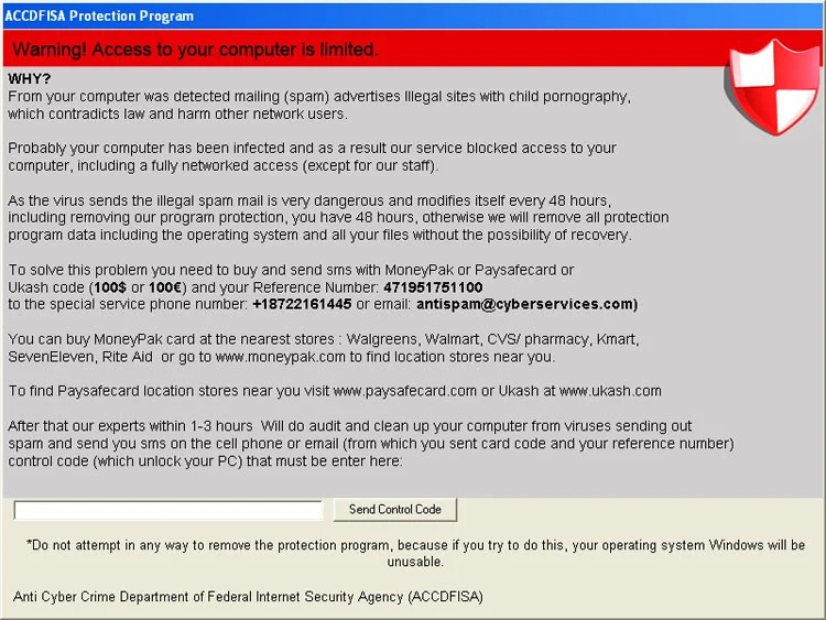 Since 2012, threat actors have been creating a variety of malware and ransomware that pretend to be government agencies warning infected Windows users that they were viewing CSAM. The malware tells victims they must pay a "penalty" to prevent their information from being sent to law enforcement.