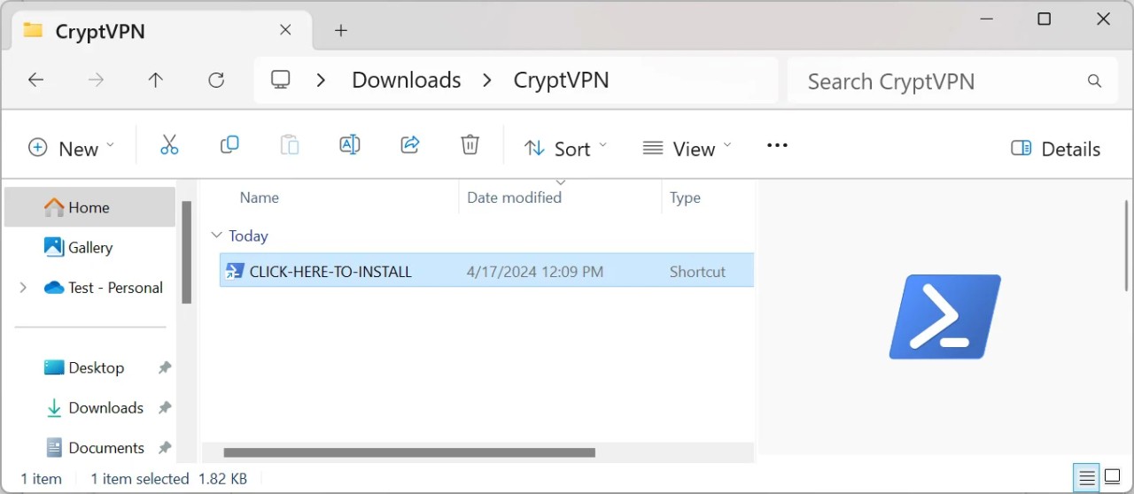 Clicking on the "Download & Install" button will download a CryptVPN.zip file from the site that, when extracted, contains a Windows shortcut called "CLICK-HERE-TO-INSTALL".