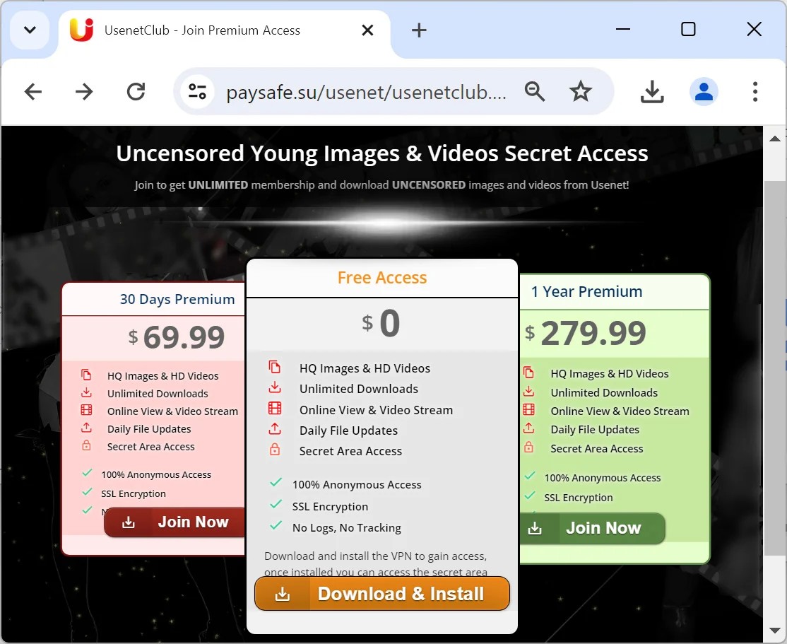 After researching the malware, it was found that threat actors created a website to impersonate UsenetClub, a subscription service for "uncensored" access to images and videos downloaded from Usenet.