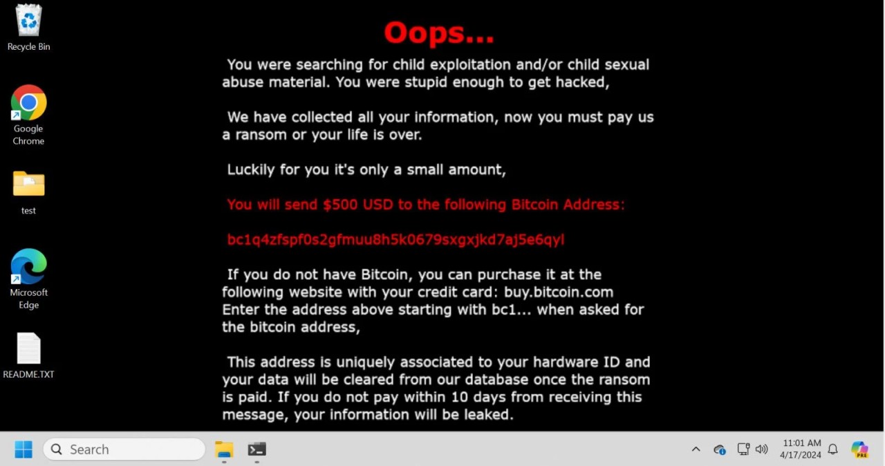 "You were searching for child exploitation and/or child sexual abuse material. You were stupid enough to get hacked," reads the extortion demand.