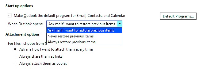 In most instances when using Office perpetual versions, the Outlook options did not display the feature causing this issue—named "Ask me if I want to restore previous items"—making it impossible for users to configure it through the user interface.