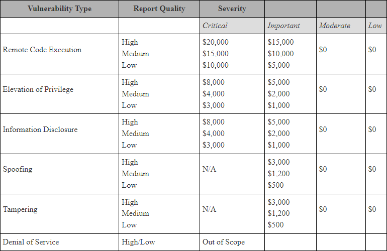 Moreover, if a submission qualifies for multiple bounty programs, the researchers will receive the highest single payout reward from a single bounty program. Further details regarding the Microsoft Bounty Program are available on this FAQ page.