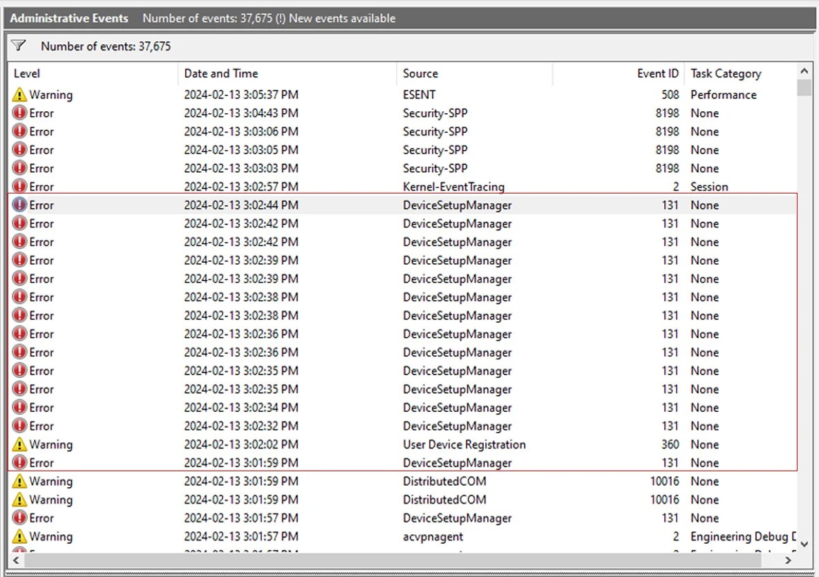 As reported by BornCity in December, this caused occasional Event ID 201 connection error events and repeated Event ID 131 errors for 'DeviceSetupManager' to appear in the Windows Event Viewer logs, with a description of "Metadata staging failed, result=0x80070490".
