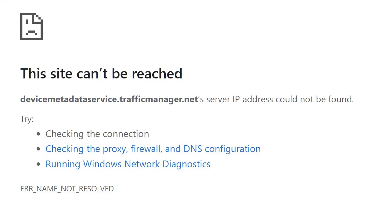 However, Microsoft has failed to associate an IP address to devicemetadataservice.trafficmanager.net in DNS, causing connection attempts to fail.