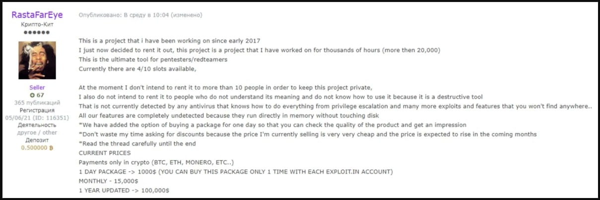 In June 2023, ZeroFox reported that someone claiming to be the original author of DarkGate attempted to sell access to the malware to ten people for the absurd cost of $100k/year.
