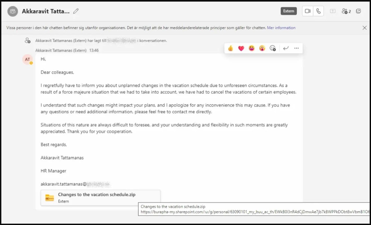 These accounts were used to trick other Microsoft Teams users into downloading and opening a ZIP file named "Changes to the vacation schedule."