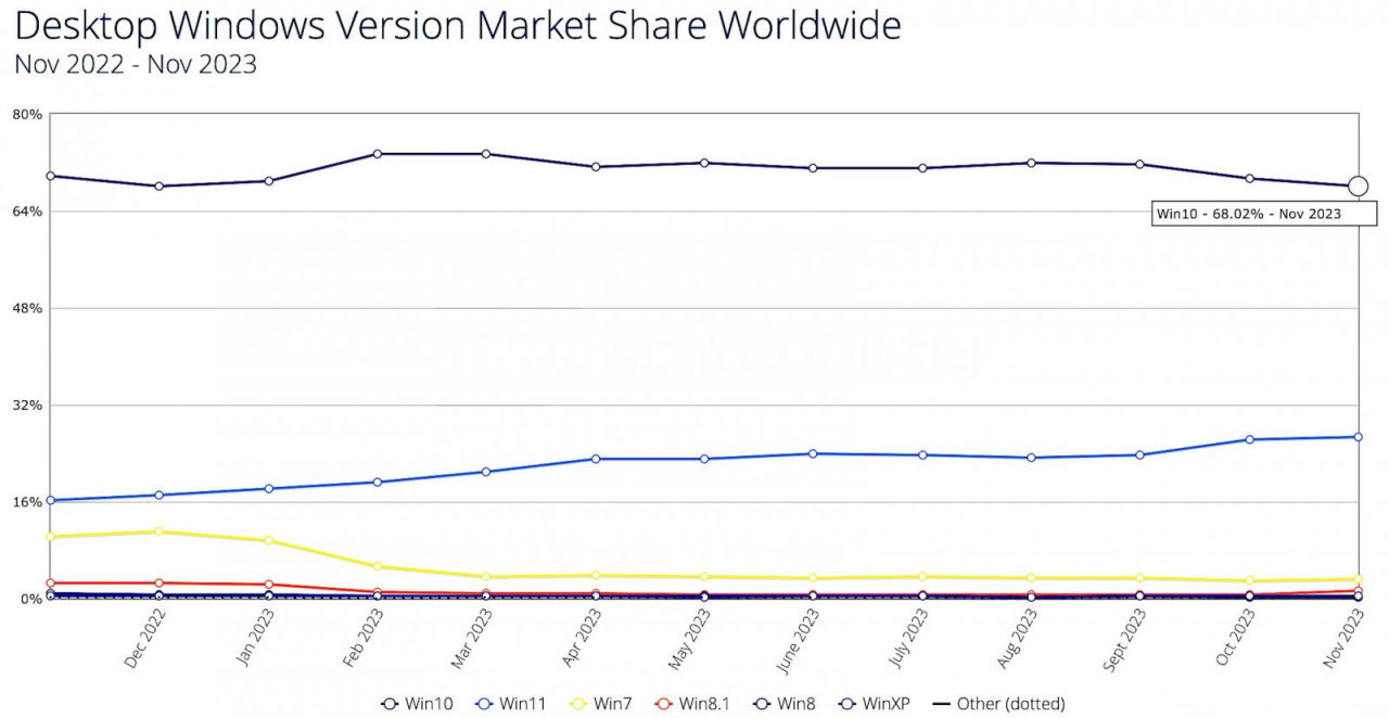 According to Statcounter Global Stats data, over 68% of all Windows systems are still running Windows 10, while only 26% of them run Windows 11.