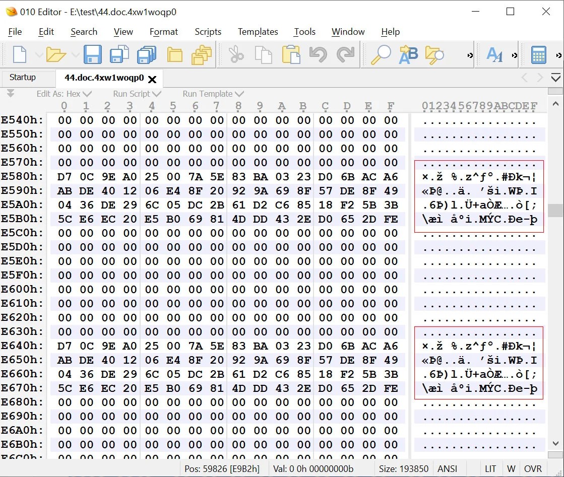 This is illustrated by the image below, where two 64-byte chunks of 'zeros' were XORed and now contain the keystream used to encrypt the file.