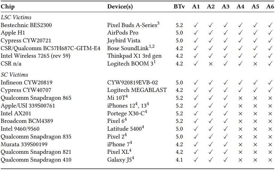 The Eurecom paper presents test results for BLUFFS against various devices, including smartphones, earphones, and laptops, running Bluetooth versions 4.1 through 5.2. All of them were confirmed to be susceptible to at least three out of six BLUFFS attacks.