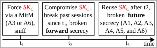 Next, the attacker brute-forces the key, enabling them to decrypt past communication and decrypt or manipulate future communications.