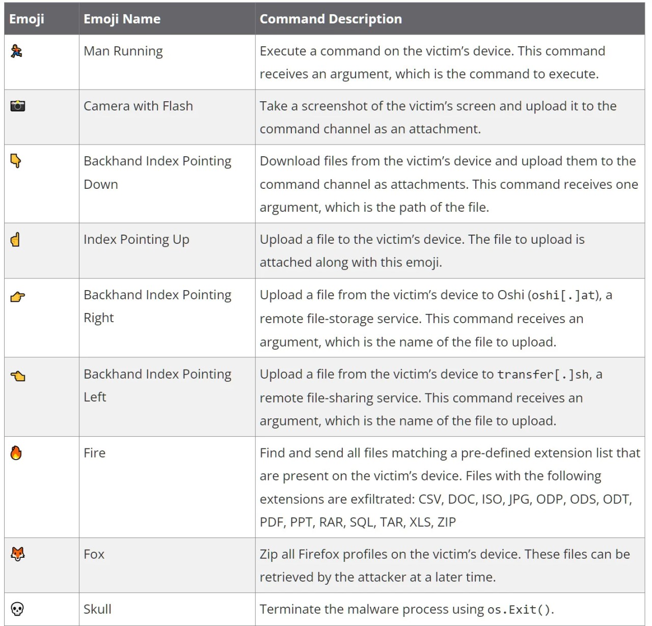 Nine emojis are used to represent commands to execute on an infected device, which are listed below.