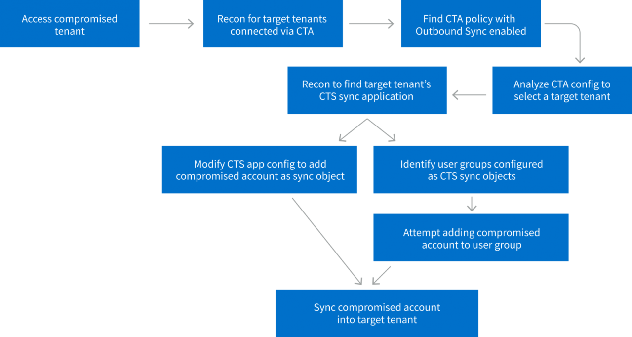 Upon finding a tenant that meets those criteria, the attacker locates the app used for CTS syncing and modifies its configuration to add the compromised user into its sync scope, gaining access to the other tenant's network. This allows the threat actor to achieve lateral movement without requiring new user credentials.
