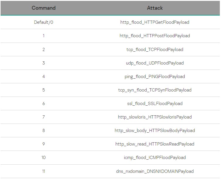 The payload commands sent by the C2 include HTTP, TCP, UDP, PING, ICMP, and SSL flood attacks aimed at a specified target.