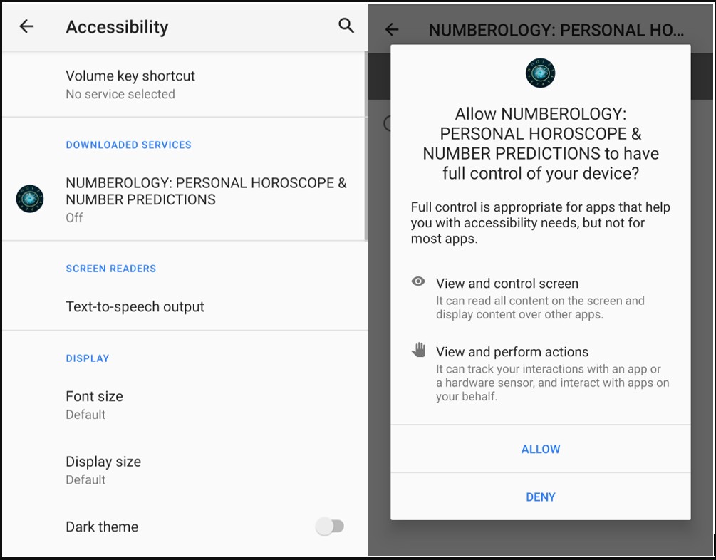 Upon installation, it requests access to the Accessibility Service, enabling it to perform privileged actions like navigation gestures, hide on-screen elements, and grant additional permissions to itself.