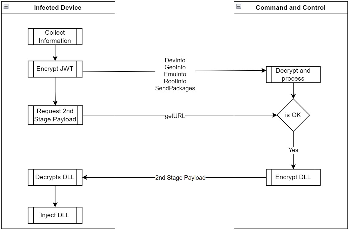 - GetURL: Requests the second-stage payload from the C2 server by providing the Android ID and receives the status and potentially an encrypted assembly DLL.