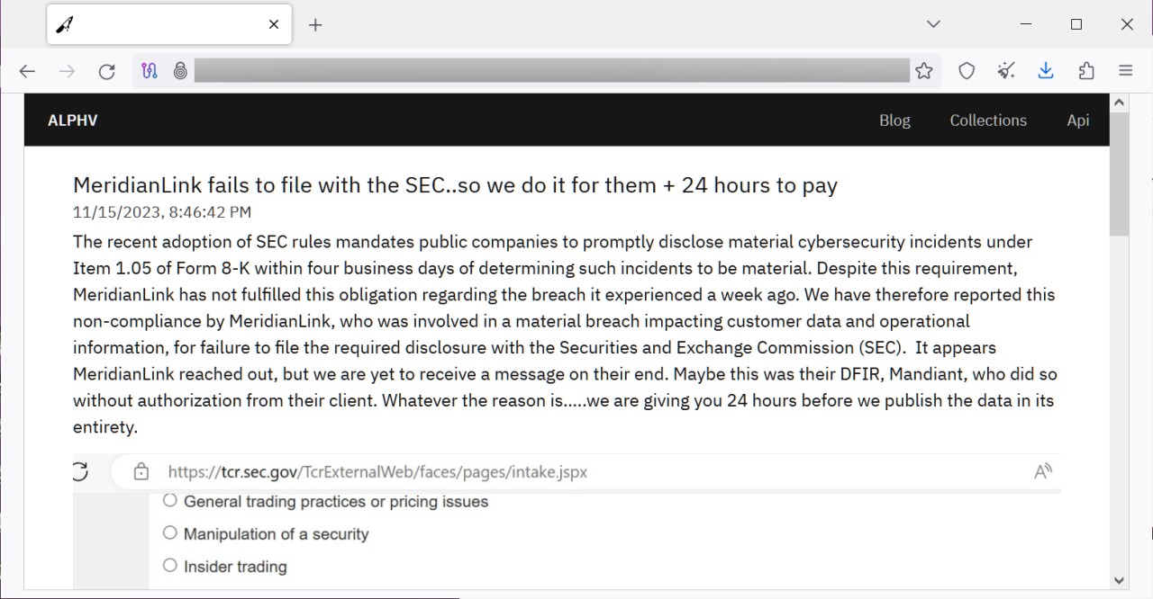 ALPHV also provided on their site the reply they received from the SEC to the complaint against MeridianLink, to show that the submission was received.