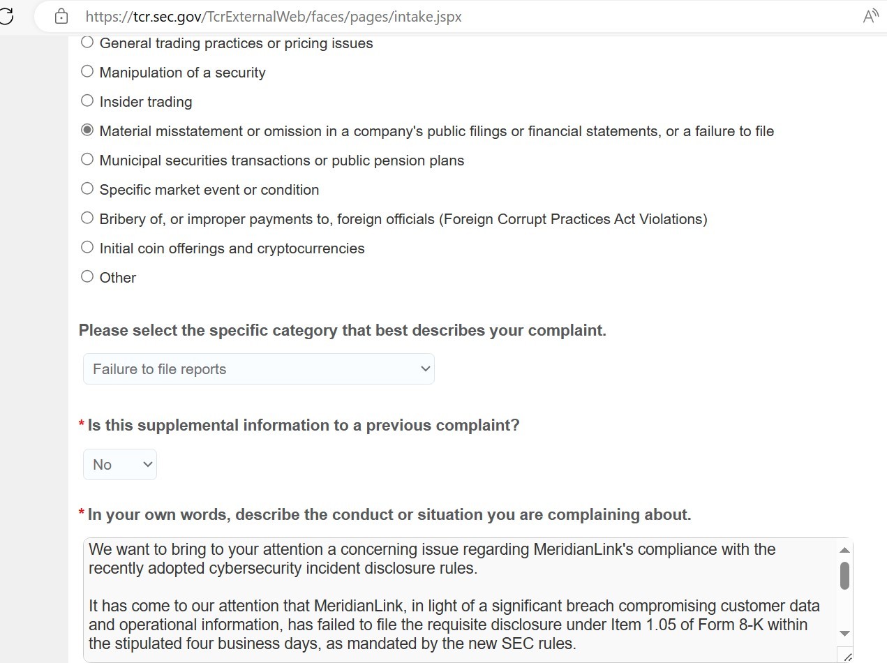 In their own words, the attacker told the SEC that MeridianLink suffered a "significant breach" and did not disclose it as required in Form 8-K, under Item 1.05.
