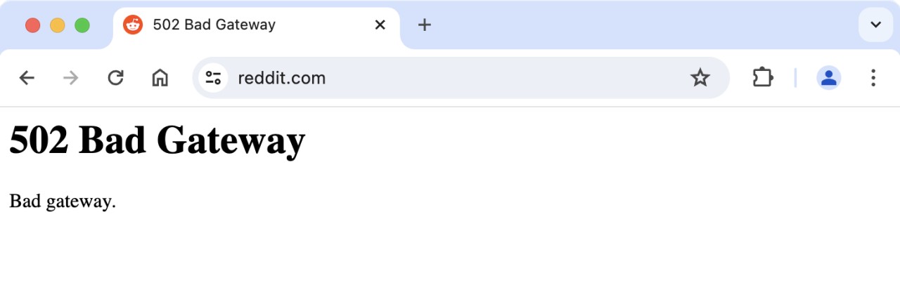 Users now see "502 Bad Gateway" and "Unknown server error" errors when accessing the Reddit website.