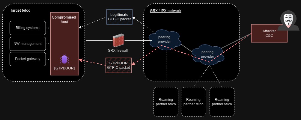 The threat actors behind GTPDOOR are believed to target systems adjacent to the GPRS roaming eXchange (GRX), such as SGSN, GGSN, and P-GW, which can provide the attackers direct access to a telecom's core network.
