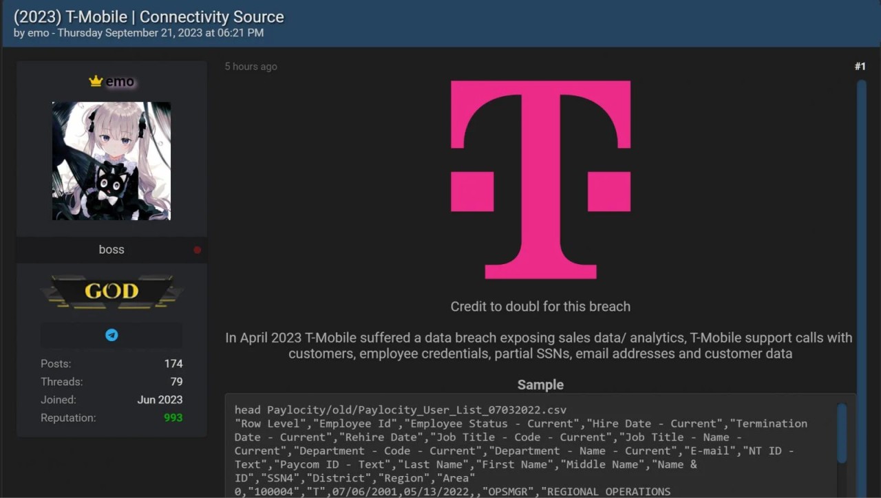 "In April 2023 T-Mobile suffered a data breach exposing sales data/ analytics, T-Mobile support calls with customers, employee credentials, partial SSNs, email addresses and customer data," reads the forum post.