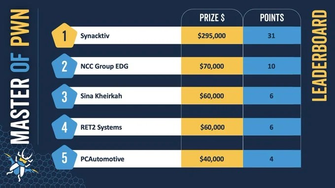 Synacktiv Team (@Synacktiv) took home $100,000 after successfully chaining three zero-day bugs to get root permissions on a Tesla Modem.