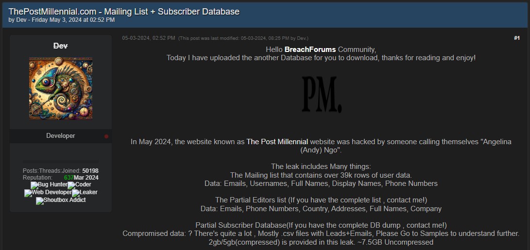As tweeted by Troy Hunt, while the data was leaked as part of The Post Millennial defacement, it is unclear where it originated from.